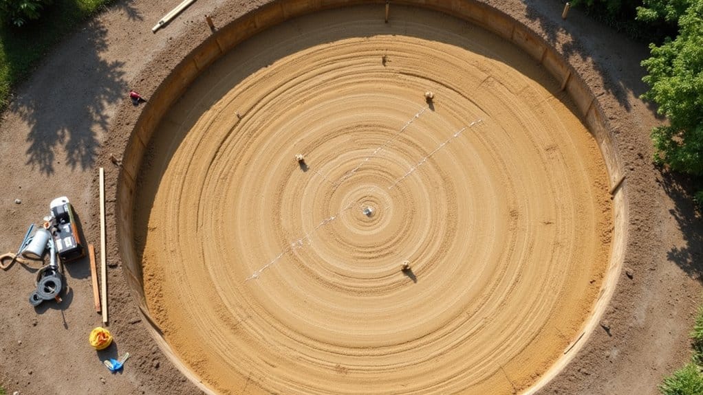 You’ll need to begin with thorough soil testing by checking density, clay content, and drainage patterns to guarantee your ground can support 2-3 tons of pool weight. A proper foundation using gravel and pool pads provides optimal stability and protection. Choosing a location away from trees and their root systems helps ensure proper water maintenance over time. Next, establish precise ground leveling by using a spirit level and long board to identify high spots and depressions, maintaining less than 1 inch of elevation variance across the entire pool footprint. A clean surface is essential, so remove all grass, rocks, and debris that could damage the liner. After compacting the soil thoroughly, verify your measurements multiple times and document the final readings before proceeding with base material installation.