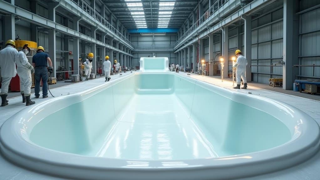 Latham’s fiberglass pools are manufactured through a precise five-layer process that starts with a UV-resistant gelcoat application. You’ll find that each pool shell incorporates chopped fiberglass with vinyl ester resin, followed by woven roving layers for structural strength. Quality control includes ultrasonic thickness measurements, visual inspections, and non-destructive testing at multiple checkpoints. This rigorous manufacturing approach guarantees your pool’s durability, with detailed specifications awaiting your exploration.