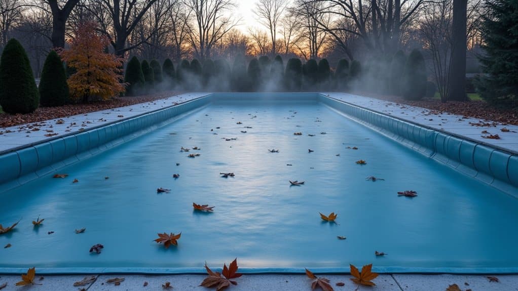While many pool owners focus on immediate maintenance costs, neglecting your pool during winter months can lead to exponentially higher expenses down the road. Without proper winter preparation, you’ll face significant repair bills across multiple areas. Surface damage alone can require resurfacing costs between $7,000-$15,000, while equipment failures from frozen pipes and burned-out pumps often exceed routine maintenance expenses. You’ll also encounter increased chemical costs from algae growth and pH imbalances, requiring specialized treatments and shock chemicals. Stagnant water can create ideal breeding conditions for disease-carrying mosquitoes, posing health risks to your family. Using a high-quality cover made from durable materials helps protect against harsh weather conditions and extends your pool’s lifespan. Continuous operation of pool pumps and filtration systems for 6-12 hours daily drives up electricity costs significantly. Utility bills spike from inefficient heating systems and excessive water loss through evaporation. Most critically, your property value can decline due to visible deterioration and potential structural issues. Proper pool maintenance during cold seasons isn’t just about preservation it’s about protecting your investment from these costly consequences.